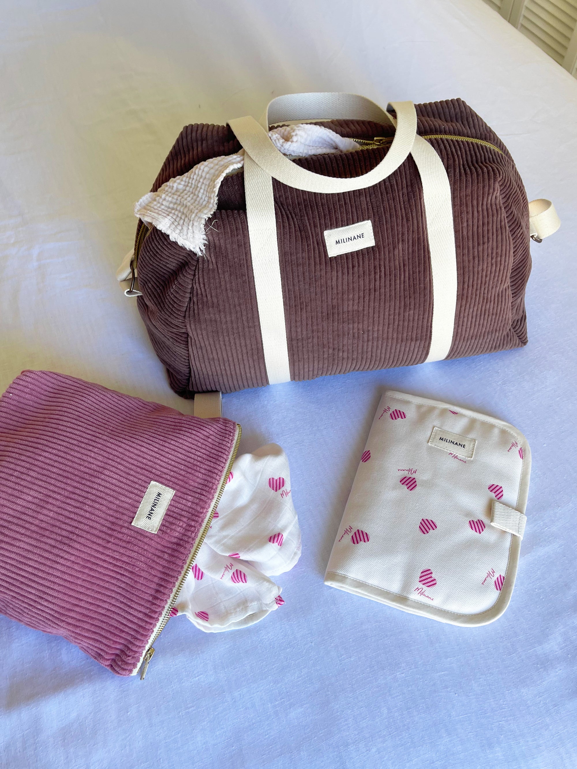 Pour les premiers sourires, les petites mains curieuses et les instants tendres, Milinane propose une collection bébé pensée avec amour. Vous y trouverez des foulards, bavoirs bandana, capes de bain, langes, sacs à langer, protège-carnet, et bien d’autres accessoires doux et pratiques.