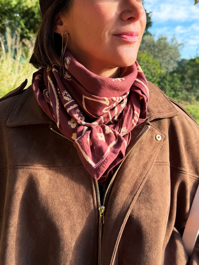 Les foulards Milinane sont confectionnés en coton doux, garantissant confort et agréable au toucher. Chaque pièce est soigneusement fabriquée en Inde, avec la technique artisanale du block print et des pigments naturels, offrant des motifs uniques et authentiques.